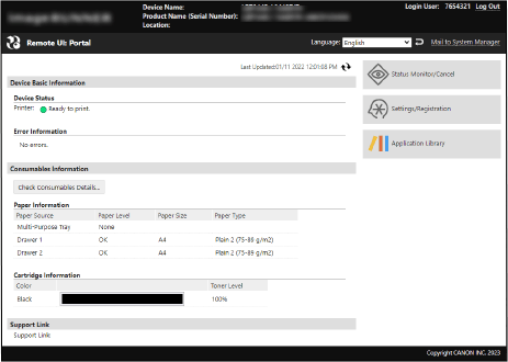 Apabila anda log masuk ke UI Jarak Jauh, halaman Portal (halaman teratas UI Jarak Jauh) muncul. Dari sini anda boleh memeriksa status operasi mesin, melihat pelbagai maklumat, dan menukar tetapan dengan operasi butang.