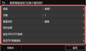 您也可以在任何功能畫面上按下 [重設] 將設定重設為此處設定的設定。