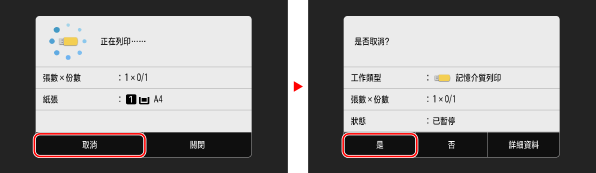 若要在使用記憶體介質列印時取消列印,請使用控制台或遠端使用者介面。