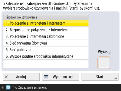 Naciśnij <Ustawienia Zarządzania> → <Ustaw. zabezpieczeń> → <Zalecane ust. zabezp. dla środowiska użytkowania>.