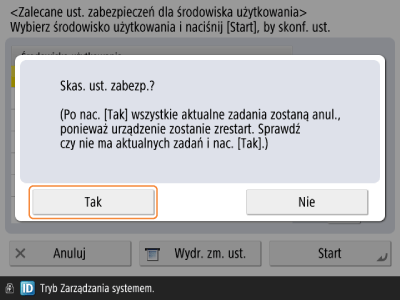 Jeżeli ręcznie zmieniono ustawienia, które zmodyfikowano za pomocą <Zalecane ust. zabezp. dla środowiska użytkowania>, zmiany nie zostaną zachowane. Urządzenie powróci do stanu sprzed wykonania <Zalecane ust. zabezp. dla środowiska użytkowania>.