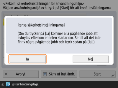 Om du har manuellt ändrat inställningar som ändrades med <Rekommend. säkerhetsuppsätt. för användningsmiljö>, bibehålls de inte. Maskinen återgår till tillståndet innan <Rekommend. säkerhetsuppsätt. för användningsmiljö> körs.