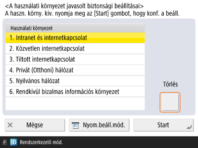 Válassza ki a <Felügyeleti beállítások> → <Biztonsági beállítás> → <A használati környezet javasolt biztonsági beállításai> lehetőséget.