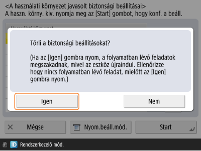 Ha manuálisan módosította azokat a beállításokat, amelyeket <A használati környezet javasolt biztonsági beállításai> segítségével állított be, a változtatások elvesznek. A készülék visszatér <A használati környezet javasolt biztonsági beállításai> szerinti végrehajtás előtti állapotba.