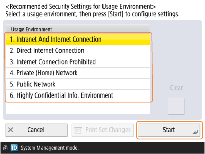 If functions you want to use become unavailable after changing the security settingsYou can undo the changes to revert the machine to its previous state. Restoring the Security Settings You can also change some settings individually. Example: If some digital services and applications cannot be used, enable the following setting in (Settings/Registration).<Preferences> → <Network> → <TCP/IP Settings> → <RAW Print Settings> * If you switch to one of the following environment types, the above setting is disabled. 2. Direct Internet Connection 4. Private (Home) Network 5. Public Network 6. Highly Confidential Info. Environment For details on the effect and impact of the security settings for each environment type, see the following. Effect and Impact of Security Settings You can also print the changed settings to check the setting values that have been changed. Checking the Settings Changed with the Recommended Security Settings |