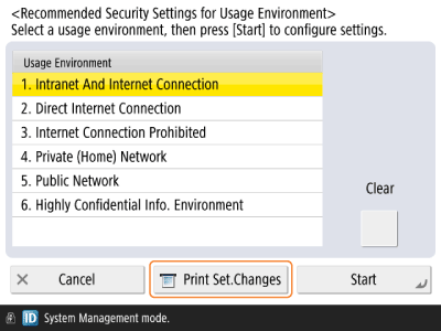 Press <Management Settings> → <Security Settings> → <Recommended Security Set. for Usage Environment>.