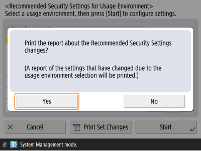 You can print a list of the settings changed with <Recommended Security Set. for Usage Environment> to check the setting values before and after change.
