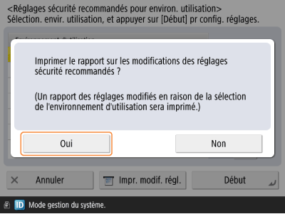 Vous pouvez imprimer une liste des réglages modifiés avec <Recommended Security Set. for Usage Environment> pour vérifier les valeurs de réglage avant et après modification.