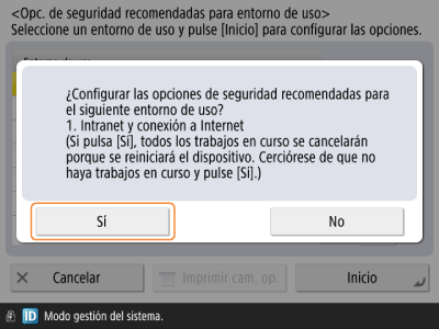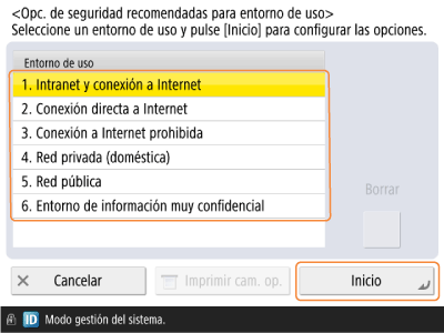 Si <Recommended Security Settings> no está disponible, puede cambiar manualmente las opciones de seguridad. Para obtener más detalles sobre el cambio manual de los ajustes de seguridad, consulte lo siguiente. Efecto e impacto de las opciones de seguridad <Recommended Security Settings> no está disponible si se establece alguna configuración de la política de seguridad. |