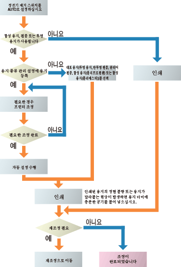 초기 조정한 후에는 인쇄용 용지 출력 설정을 확인하십시오.