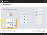 2 | Seleccioneu el tipus de sobres carregats al dipòsit de paper. Si no s'estableix correctament el tipus de sobre, es produirà un encallament. Quan utilitzeu sobres de mida personalitzada, premeu <Person.>  <Següent>  introduïu les dimensions del sobre. Premeu <X> o <Y>  utilitzeu les tecles numèriques per introduir la longitud de la mida respectiva. |