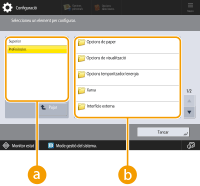 Premeu que apareix a les pantalles d'<Inici> i de Funcions bàsiques per personalitzar la pantalla, com ara reorganitzar botons o crear una tecla de drecera. Personalització de la pantalla tàctil![]() Podeu canviar les opcions corresponents a la visualització de la pantalla, com ara la pantalla que apareix immediatament després d'engegar l'equip i si apareix el missatge de paper tòner i restant. <Opcions de visualització> Podeu establir la pantalla que es mostrarà quan hagi transcorregut una determinada quantitat de temps sense que s'hagi fet servir l'equip. <Funció després de reinici automàtic> |