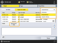(Monitor estat), es mostra la pantalla Monitor estat, que us permet comprovar l'historial d'ús de cada funció, com ara còpia, impressió, enviament de correu electrònic, enviament o recepció d'I-faxos, etc. Des d'aquesta pantalla també podeu imprimir l'historial d'ús de cada funció.![]() |