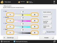 <Ajust fi de densitat>Seleccioneu un color i ajusteu-ne el nivell de densitat segons l'àrea de densitat amb els botons <-> o <+>. Un cop finalitzat l'ajust, premeu <Bé>.
