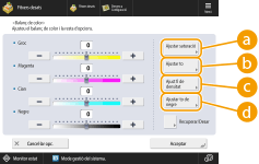 Podeu desar fins a quatre opcions després de l'ajustament. Un cop ajustat el color, premeu <Recuperar/Desar>  seleccioneu un botó de <C1> a <C4>  premeu <Desar>  <Sí>  <Bé>. |