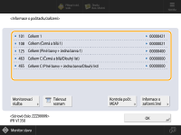 Stiskněte tlačítko <Monitorovací služba> <Test komunikace> a zkontrolujte komunikaci se serverem vzdáleného monitorování. Po aktivaci této funkce se informace o zařízení budou pravidelně odesílat na server vzdáleného monitorování. Aby bylo možné funkci používat, je nezbytné povolit komunikaci mezi zařízením a serverem poskytujícím službu.Na stroji můžete vytisknout seznam s počtem stran použitých pro kopírování, tisk a skenování. Na této obrazovce můžete také zkontrolovat stav počitadel pro jednotlivé aplikace MEAP. Stiskněte <Kontrola počit. MEAP> na obrazovce v kroku 2. Stisknete-li na stejné obrazovce <Informace o zařízení/Jiné> <Kontr. konfig. zařízení>, můžete zkontrolovat volitelné doplňky nainstalované na stroji a verzi bezpečnostního čipu pro šifrování dat na úložném zařízení.Informace týkající se podmínek počtu získáte u prodejce nebo servisního zástupce. |