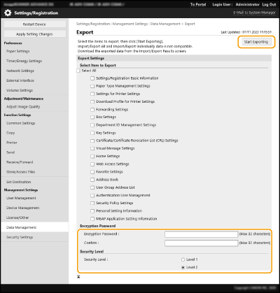 vyberte úroveň zabezpečení z nabídky [Security Level] klikněte na [Start Exporting]