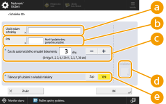 <Čas do automatického smazání dokumentu>Stisknutím <->/<+> změňte časový úsek, po jehož uplynutí se uložené soubory automaticky odstraní. Nastavíte-li jej na „0“, soubory nebudou odstraněny.