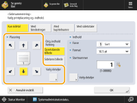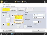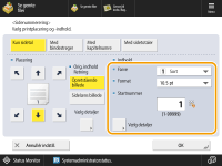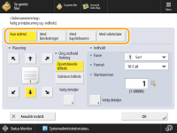 Numre og symboler printes ikke på omslag (Tilføjelse af et for- og bagomslag) eller indlægssider (Indsættelse af ark og kapitelsider (Indsæt ark)). Nummerering af kopisæt printes på alle printede sider. Nummerering af kopisæt kan printes sammen med datoer eller tekst. <Indstillinger for nummerering af kopisæt> Teksten for <Sidenummerering> og <Vandmærke> kan også vælge fra tekst, der er registreret i <Registrér tegn til sidenummerering/vandmærke>. Hvis du indstiller to af <Sidenummerering>, <Vandmærke>, <Printdato> eller <Nummerering af kopisæt> til at printe i den samme position, vises en meddelelse, der spørger, om du vil printe med disse indstillinger, når du trykker på Start print. Hvis du vælger <Med kapitelnumre> i kombination med <Indsæt ark>, tælles kapitelnumrene på følgende tidspunkter: Efter hver Kapitelside er sat i Efter hver indsættes skilleark Hvis du indstiller <Indstillinger for nummerering af kopisæt> til <Til>, kan de indstillinger, du angiver, blive ændret på følgende måde. <Indstillinger for nummerering af kopisæt> Du kan ikke længere vælge <Hele overfladen> og <Tal i 5 placeringer> for printpositioner i statussen Side-/Kopisætnummerering. Talstørrelsen i statussen Side-/Kopisætnummerering bliver <10,5 pkt>, <12,0 pkt> og <14,0 pkt>. |