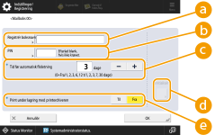 <Tid før automatisk filsletning>Tryk på <->/<+> for at ændre perioden, indtil gemte filer slettes automatisk. Ved indstilling til "0" slettes filer ikke.