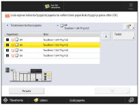 Paperia lisäämään kehottava ikkuna avautuu myös jos valittu paperisäiliö ei ole kunnollisesti laitteen sisällä. Varmista, että paperisäiliö on oikein paikallaan. Älä aseta seuraavia paperityyppejä paperisäiliöön. Se saattaa aiheuttaa paperitukoksen. Voimakkaasti käpristynyt tai rypistynyt paperi ohut lämpökopiopaperi Paksu paperi (yli 500 g/m2) Ohut paperi (vähemmän kuin 60 g/m2) Lämpösiirtomenetelmällä tulostettu paperi Lämpösiirtomenetelmällä tulostetun paperin kääntöpuoli. Kun paperilähteessä ei ole riittävästi paperia, paperi voi rypistyä tai taittua kulmista, jos käytetään päällystettyä paperia, jonka paksuus on 90 g/2 tai vähemmän, tai päällystämätöntä paperia, jonka paino on 60 g/m2. Vältä käyttämästä tällaista paperia, kun näytössä näkyy seuraava paperimäärän ilmoitus: Jos paperi rypistyy, kun se syötetään pystysuunnassa, syötä paperi vaakasuunnassa. Muista tuulettaa paperiarkit huolellisesti ennen kuin asetat ne. Ohut paperi, uusiopaperi, rei'itetty paperi, paksu paperi, kalvot, kirkas filmi, läpikuultava filmi ja indeksivälilehtipaperi tulee tuulettaa erityisen hyvin ennen niiden asettamista. Jos paperi loppuu ja tulostus pysähtyy käyttäessäsi nidontaa, älä poista nidontaa odottavia luovutettuja arkkeja. (Tulostus ja nidonta jatkuvat kun olet poistanut paperitukoksen.) Älä nosta paperisäiliöiden sisällä olevaa nostinta kun päävirta on kytkettynä, sillä se voi aiheuttaa toimintahäiriön ja vaurioittaa laitetta. Jos sinun on nostettava nostinta, esimerkiksi pudotettuasi jotain säiliön sisälle, katkaise päävirta kun paperisäiliö on auki. Jos haluat ohjeet laitteen sammuttamiseksi, katso "Laitteen sammuttaminen". ![]() |