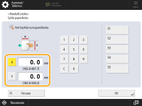 Valitse kummankin sivun pituus numeropainikkeilla valitsemalla <X> tai <Y>. ![]() Kun tallennat usein käyttämäsi paperikoot painikkeille <S1>–<S5>, voit käyttää niitä yhdellä painalluksella. Vapaan paperikoon (Muokattu paperikoko) tallentaminen | |