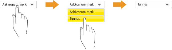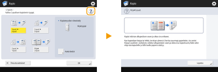 Käytä Ohje-toimintoaNäytössä olevasta toiminnosta riippuen ylhäälle oikealle tulee joskus esiin kohta  . Paina kohtaa  tarkistaaksesi toiminnon kuvauksen ja toimintamenetelmän. Palaa edelliseen näyttöön valitsemalla <Lopetus>. Toimi samalla tavalla kuin älypuhelimella (pyyhkäise / laajenna tai supista / vedä ja pudota)Joissakin näytöissä voit vaihtaa sivua tai selata pyyhkäisemällä sormellasi ylös/alas tai vasemmalle/oikealle, kuten älypuhelimella. Voit myös zoomata lähemmäksi ja kauemmaksi näytössä käyttämällä kahta sormea laajentamalla ja supistamalla. Voit vetää suurennettua ikkunaa sormellasi. Näytön ulkoasun ja toiminnallisten ehtojen mukauttaminenJos <Ota käyttöön näytön suurennus> -asetuksena on <Kyllä>, koko näyttöä lähennetään/loitonnetaan, kun käytetään laajentamista tai supistamista esikatseluikkunassa. Jos <Ota käyttöön näytön suurennus> -asetuksena on <Ei>, vain esikatseluikkunaa lähennetään/loitonnetaan. Esikatseluikkuna Esikatseluikkuna | | | Jos <Ota käyttöön näytön suurennus> -asetuksena on <Kyllä> | tai