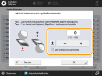 Tämä toiminto saattaa vaikuttaa paperin syöttöön. Koska suuri arvon lisääminen saattaa aiheuttaa paperitukoksia, on suositeltavaa säätää arvoja pienin askelin. Jos kulma taitetaan, kun tulostetaan molemmille puolille, väärät käpristymän korjausasetukset kaksipuolisen tulostuksen ensimmäisellä sivulla voivat aiheuttaa paperitukoksen. |