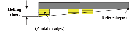 Helling van de vloer (Deze methode wordt gebruikt wanneer de vloer een beetje hellend is.) | Plaats twee vloerplaten naast elkaar en plaats ze op de vloer waar de machine moet worden geïnstalleerd. Volgens de meetmethode van de 'vloervlakheid', plaats een enkele vloerplaat horizontaal. Plaats vervolgens de afstandhouders (munten) onder een andere vloerplaat om de plaat horizontaal te plaatsen met dezelfde hoogte als de plaat die u eerst hebt geplaatst. Plaats in dit geval de afstandhouders op de willekeurige positie van de rand van de vloerplaat. Meet de hellingshoek van de vloer met de dikte van de afstandhouders die het meest verwijderd zijn van het referentiepunt (het punt bepaald als een maatstaf voor de hoogte). (Zie de afbeelding hieronder.)