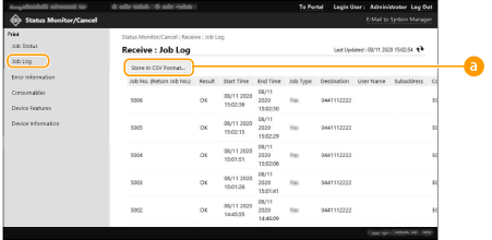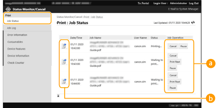 U kunt de Remote UI (UI op afstand) gebruiken om de status te controleren van documenten in de wachtrij te controleren, evenals van logboeken voor documenten die al zijn verwerkt. U kunt u ook de status van de machine controleren, zoals foutgegevens en de resterende hoeveelheid verbruiksmaterialen.