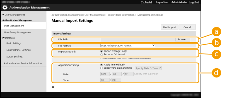 Importeert gebruikersgegevens die zijn geëxporteerd vanaf een Canon-machine met behulp van de Lokale apparaat authentificatie van SSO-H. De bestandsindeling is "LDIF".