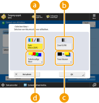 | U kunt de kleurmodus voor afdrukken selecteren. U kunt zo bijvoorbeeld toner besparen door originelen in kleur af te drukken in zwart-wit of door kaartjes in één kleur af te drukken, zoals rood of blauw, om de distributiedatum aan te geven. |