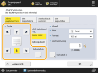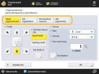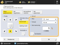 Getallen en symbolen worden niet afgedrukt op voor- en achterbladen (Toevoegen van een omslag en achterblad) of invoegvellen (Vellen en hoofdstukpagina's invoegen (Invoegvellen)). Kopiesetnummers worden op alle afgedrukte pagina's afgedrukt. Kopiesetnummers kunnen samen met datums of tekst worden afgedrukt. <Instellingen Kopiesetnummering optie> De tekst voor <Paginanummering> en <Watermerk> kan ook worden geselecteerd uit de tekst die is geregistreerd in <Registreer tekens voor paginanummering/watermerk>. Als u twee van de modi <Paginanummering>, <Watermerk>, <Datum afdrukken> of <Kopiesetnummering> instelt voor afdrukken op dezelfde plaats, verschijnt een bericht waarin u wordt gevraagd of u wilt afdrukken met deze instellingen wanneer u op <Start afdrukken> drukt. Als u <Met hoofdstuknummers> selecteert in combinatie met de modus <Vellen invoegen>, worden de hoofdstuknummers als volgt geteld: Nadat elke hoofdstukpagina is ingevoegd Na elk ingevoegd invoegblad Als u <Instellingen Kopiesetnummering optie> instelt op <Aan>, worden de instellingen die u kunt opgeven, als volgt gewijzigd. <Instellingen Kopiesetnummering optie> U kunt <Volledige oppervlak> en <Cijfers op 5 plaatsen> niet meer selecteren voor afdrukposities in de modus Kopiesetnummering. De nummerformaten van de modus Kopiesetnummering worden <10,5 pt>, <12,0 pt> en <14,0 pt>. |