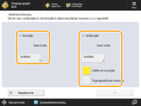 Als u de afbeelding op de achterzijde wilt verplaatsen bij het afdrukken op beide zijden, is de instelling <Achterzijde> nodig. Om te verplaatsen naar dezelfde positie als op de voorzijde, drukt u op <Zelfde als voorzijde>. Om symmetrisch te verplaatsen, drukt u op <Tegengesteld aan voorzijde>. Om te verplaatsen naar een andere positie dan op de voorzijde, drukt u op <Instellen> en voert u de verplaatsingsafstand in.