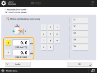 Naciśnij <X> albo <Y>, aby wprowadzić długość danego boku za pomocą klawiszy numerycznych. ![]() Jeżeli przypiszesz często używany format papieru do przycisków od <S1> do <S5>, możesz z nich korzystać na zasadzie jednoprzyciskowej. Rejestrowanie papieru o formacie dowolnym (Niestandardowy format papieru) | |