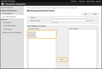 Kliknij pozycję [Add Group (Local Device Users)...] lub [Add Group (Other Users)...].