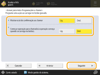 Se selecionar <Ligado> para <Começar operação para chamada (a operação começa quando se carrega no botão).>, a impressão começa quando carregar no botão gravado sem carregar em <Inic. impressão>. Selecione <Desligado> se pretender começar a imprimir manualmente ao carregar em <Inic. impressão>.