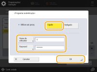 <Programar autenticação>Para utilizar a função de autenticação do servidor proxy, carregue aqui e configure as informações de autenticação. No ecrã apresentado, carregue em <Ligado>, introduza o nome de utilizador e a palavra-passe a utilizar na autenticação do proxy e carregue em <OK>.
