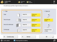2 | Selecione as programações de cópia em <Guarda anterior> e <Guarda posterior> carregue em <OK>.Carregue em <Deixar em branco> se não quiser copiar na guarda. Se puxar papel para a guarda a partir do "Document Insertion Unit-R", selecione <Deixar em branco>. Para especificar papel para a guarda, carregue em <Alterar> para <Selecionar papel> selecione a origem do papel carregue em <OK>. |