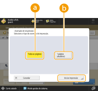 Não pode selecionar <Exemplo de impressão> para os seguintes trabalhos. Um trabalho para o qual está programado o modo Agrupar ou Offset Agrupar Um trabalho que está em pausa ou à espera de ser copiado Um trabalho que está atualmente a ser impresso como exemplo Um trabalho que está atualmente a ser impresso como exemplo Se a cópia restante for a última ou quase a última, não pode fazer um exemplo de impressão selecionando <Todas as páginas>. Se as páginas de um trabalho cópia forem poucas, pode não conseguir fazer um exemplo de impressão selecionando <1 página (aleatória)>. A impressão pode demorar algum tempo, mesmo que selecione <Exemplo de impressão>. |