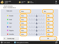 <Ajustar saturação>Para programar a saturação de todas as cores, utilize o botão <Baixo> ou <Alto> para <Todas cores>. Para programar cada cor separadamente, utilize o botão <Baixo> ou <Alto> para cada cor. Quando o ajuste estiver concluído, carregue em <OK>.