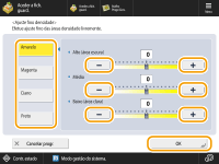 <Ajuste fino densidade>Selecione uma cor e ajuste o respetivo nível de densidade de acordo com a área de densidade utilizando o botão <-> ou o botão <+>. Quando o ajuste estiver concluído, carregue em <OK>.