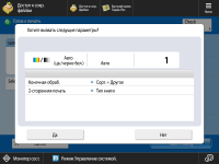 Если для параметра <Запустить вызываемую операцию (Операция запускается при нажатии кнопки.)> установлено значение <Выкл.>, то после нажатия кнопки <Да> отобразится экран настройки. На нем можно изменить параметры, прежде чем нажать клавишу <Пуск печати> для выполнения операций.
