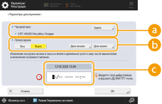 <Летнее время>Чтобы задать летнее время, нажмите кнопку <Вкл.> и укажите дату и время с помощью кнопок <Дата начала> и <Дата оконч.>. Чтобы задать дату, укажите день недели и неделю месяца.