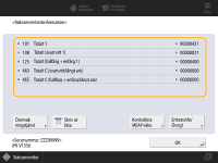 Tryck på <Övervakningstjänst> <Kommunikationstest> för att kontrollera kommunikationen med fjärrövervakningsservern. När den här funktionen körs skickas information på maskinen regelbundet till fjärrövervakningsservern. Det är nödvändigt att aktivera kommunikation mellan maskinen och servern som tillhandahåller tjänsten, för att använda funktionen.Du kan skriva ut en lista som visar antalet sidor som används för kopiering, utskrift och scanning. På den här skärmen kan du också kontrollera räknarinformation för varje MEAP-program. Tryck på <Kontrollera MEAP-räkn.> på skärmen i steg 2. Om du trycker på <Enhetsinfo/Övrigt> <Kontr. enh.- konfiguration> på samma skärm, kan du kontrollera vilka tillval som installerats på maskinen och version för säkerhetschipet för kryptering av data på lagringsenheten.Kontakta din återförsäljare eller servicerepresentant för information om räkningsvillkoren. |