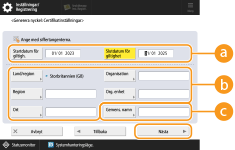 Hantera nycklar och certifikatDu kan kontrollera detaljerade inställningar eller ta bort nycklar och certifikat på skärmen som visas när du trycker på (Inställningar/Registrering) <Hanteringsinställningar> <Enhetshantering> <Certifikat - inställningar> <Lista över nycklar och certifikat>. Om listan över nycklar och certifikat inte visas, tryck på <Lista över enhetens nycklar och certifikat> för att visa den.Om Om Om du väljer en nyckel och certifikat och trycker på <Certifikatinformation>, visas detaljerad information om certifikatet. Du kan också trycka på <Verifiera cert.> på skärmen för att kontrollera om certifikatet är giltigt. Om du vill ta bort nycklar och certifikat, väljer du det vill ta bort och trycker på <Radera> <Ja>. |