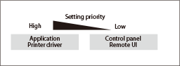 For settings available only on the control panel or from the 'Settings/Registration' menu in the Remote UI, the most recently specified settings take priority.