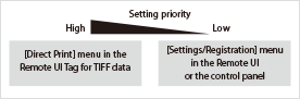 Settings specified with either tags in the IFD (Image File Directory) held in the header of TIFF data of an image file or with the 'Direct Print' menu in the Remote UI take priority over settings specified with the control panel or Remote UI.