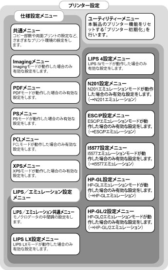 各動作モード(LIPS LX、LIPS IV、N201、ESC/P、I5577、HP-GL、HP-GL/2)の設定をします。LIPS、N201、ESC/P、I5577、HP-GL、HP-GL/2の各モードに共通の「LIPS/エミュレーション共通メニュー」と専用の「LIPS LX設定メニュー」、「LIPS4設定メニュー」、「N201設定メニュー」、「ESC/P設定メニュー」、「I5577設定メニュー」、「HP-GL設定メニュー」、「HP-GL/2設定メニュー」があります。
