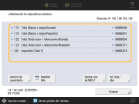 En esta pantalla, también puede consultar la información del contador para cada aplicación MEAP. Pulse <Revisar con. de MEAP> en la pantalla en el paso 2. Si pulsa <Inf. disp./otra> <Revisar conf. dispositivo> en la misma pantalla, puede consultar las opciones instaladas en el equipo y la versión del chip de seguridad relativo al cifrado de datos del dispositivo de almacenamiento.